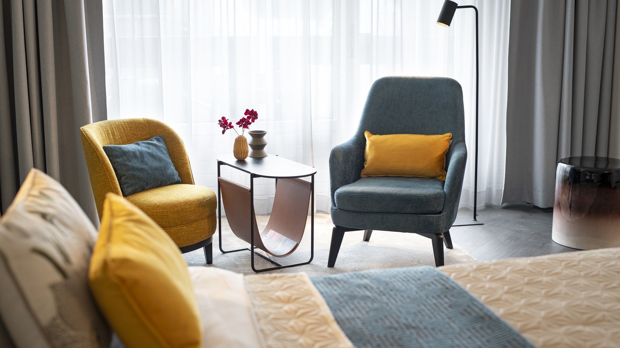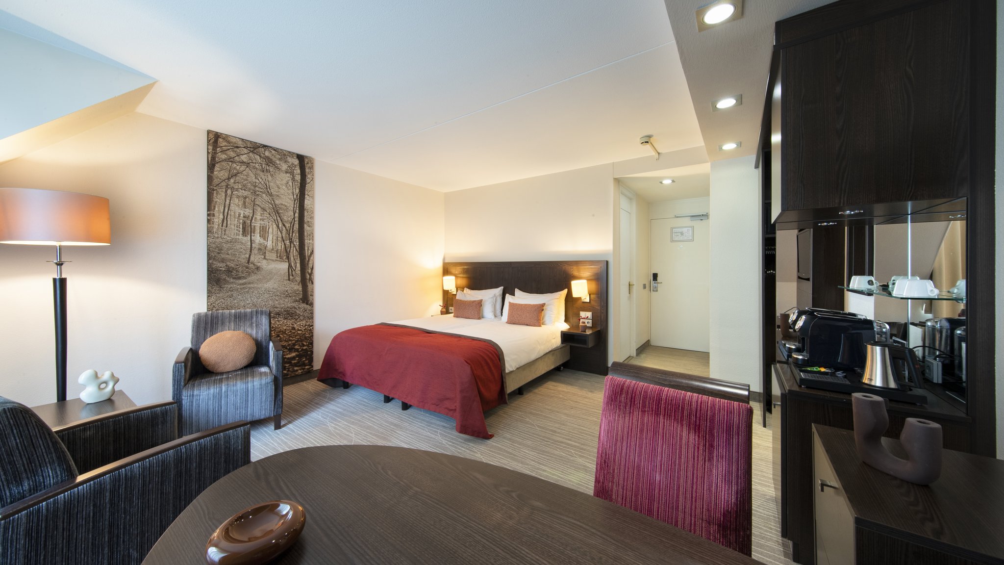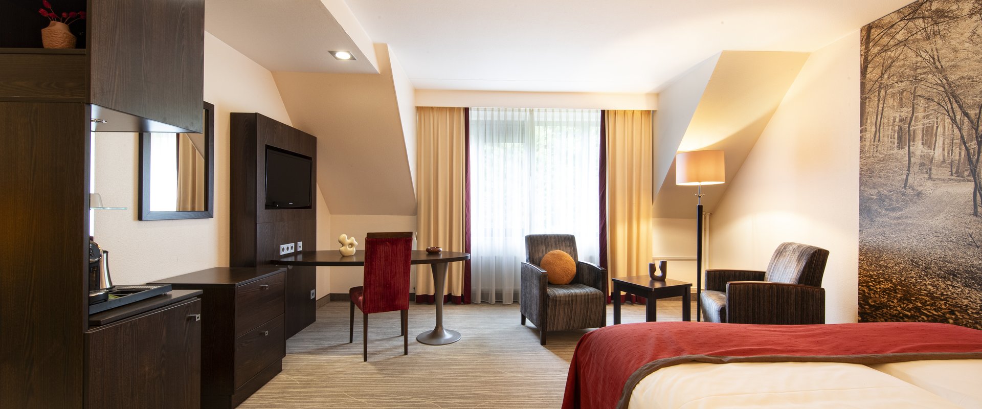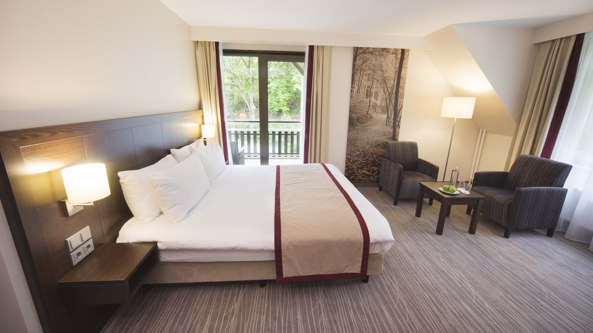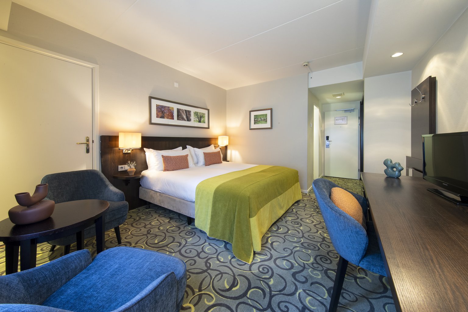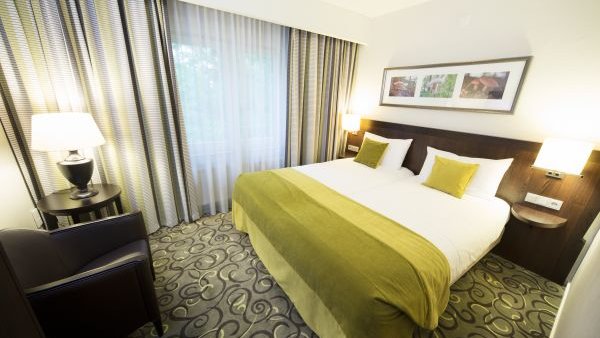 Sfeervol ingerichte hotelkamer met gratis wifi. De fris groene inrichting verwijst naar de bosrijke omgeving.